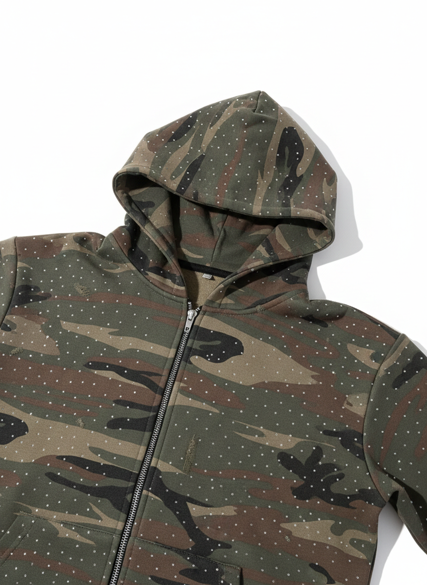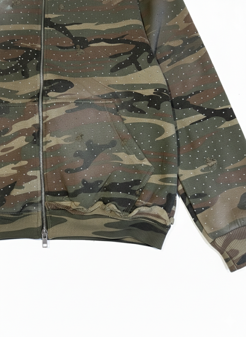 Designed for those who move with intention. This isn’t just a hoodie, it’s a heavyweight statement piece. Crafted from a custom camouflage blend and hand finished with high weight rhinestones that capture light without losing their edge.